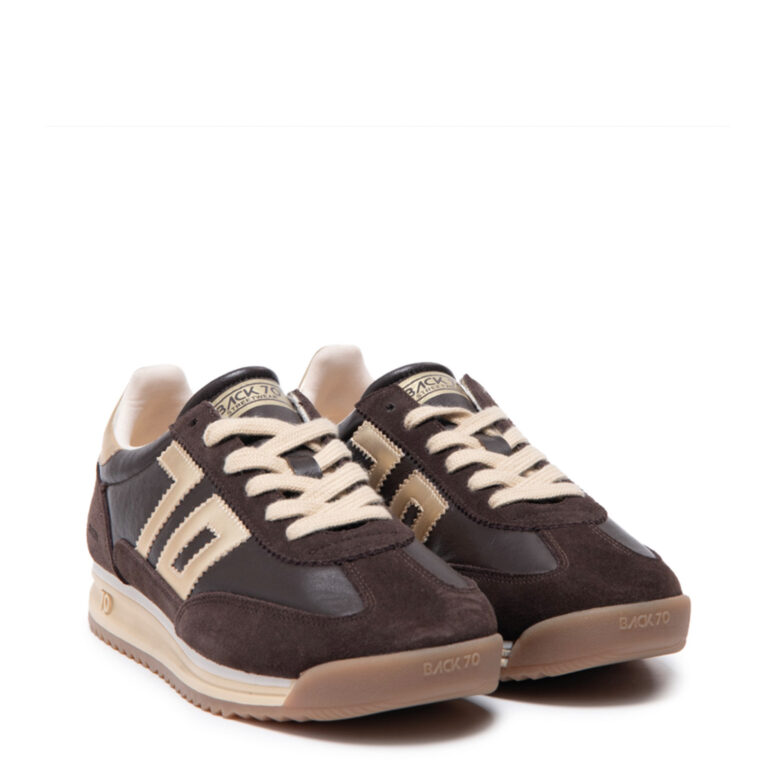 - Logo e linguetta sul tallone in pelle laminata color oro.