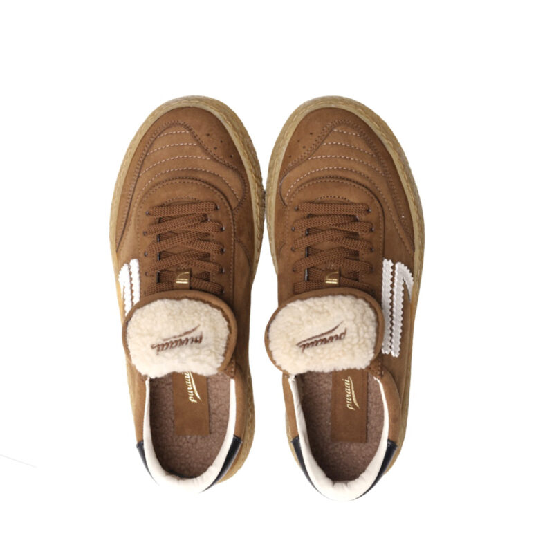 - Tomaia in microsuede marrone con pelliccia vegana.